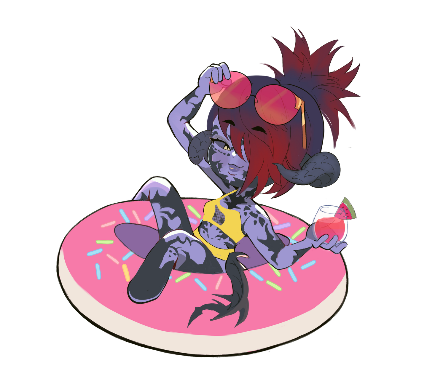 -She dyed her hair red consistently until through HW where it started to grow it's natural blue back and she's kept the tips since then (IRL-lore tidbit, she originally had red hair and blue highlights, played around with other hairstyles all pre-Rainmaker and even went red/orange. I actually forgot the order the hair went and made it blue/red instead of red/blue and it just stuck, lucky mistake)