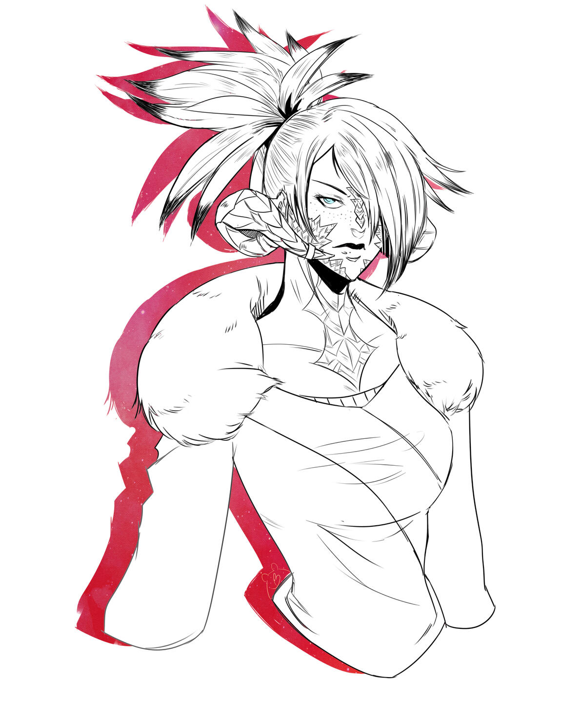 Appearance: A stockier, buff and butch looking woman, large muscles peek from underneath her common dress of medium leather armors with pieces of metal here and there. Her Xeala features are much more prominent, being a much large tail and her numerous scales that cover her entire body and face, with faint scars and general minor recovered injuries from over the years of front lining. Has one grey eye with a darker grey limbal ring and black sclera. She is missing her left eye and has a trail of scars dragging across the whole left side of her face. A Smug smile is usually present on her face.